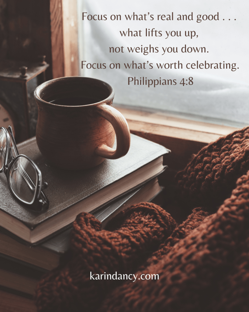 I’m no Pollyanna, so this isn’t an appeal for fake positivity. This is simply a reminder to remember this when your mind starts wandering toward worry: what we choose to dwell on shapes our peace. So when worry pops up, let’s refocus on what’s real and good . . . things that lift us up, not weigh us down. Let’s look for beauty, not mess. Keep our eyes on what’s worth celebrating.